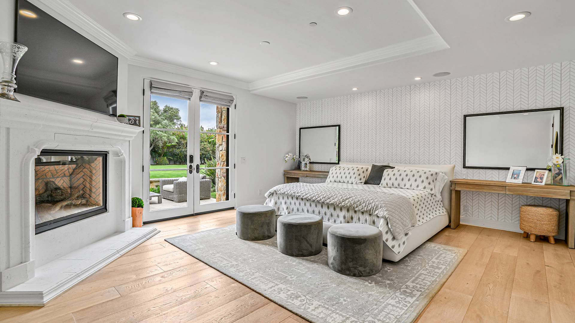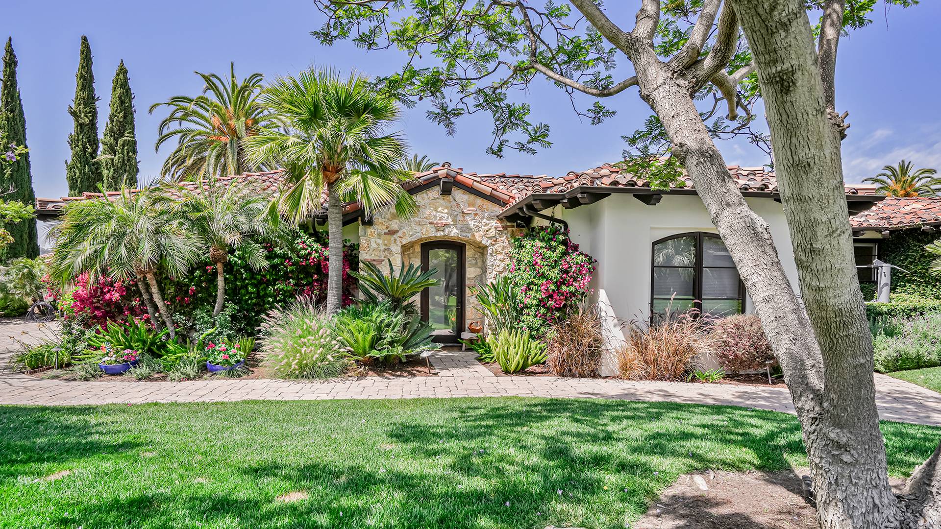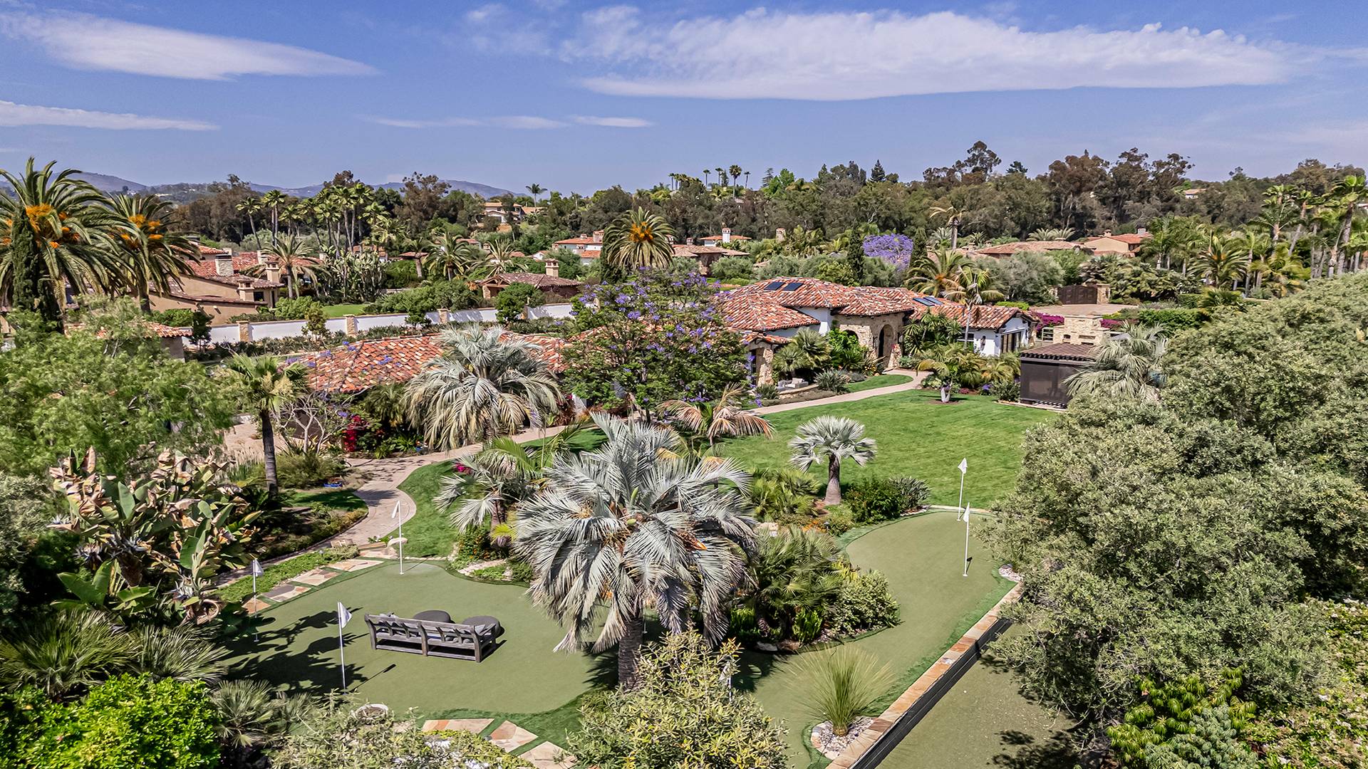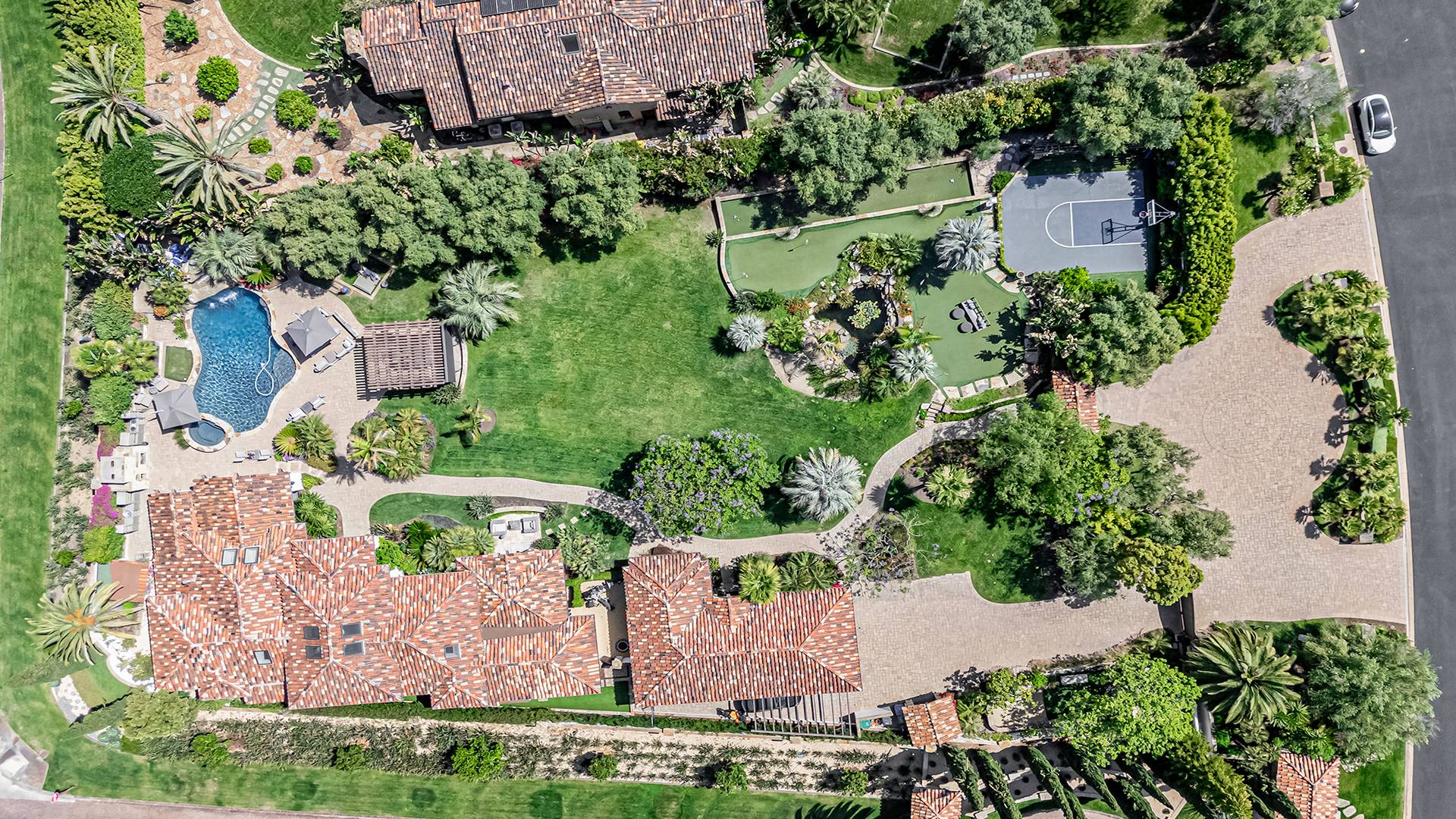 — Located in the guard-gated community of just 14 luxury homes offering privacy and exclusivity — Desirable single-level estate with a Tuscan influence and modern flare — Nearly 2 acres of fully usable grounds that evoke tranquility and relaxation — Custom-designed 5 bedroom, 4 bathroom estate, including the detached guest house with its own kitchen — Expansive private grounds featuring pool, spa, waterfall, covered veranda, built in BBQ and pizza oven, basketball half court, bocce court, putting green, horseshoe pit, large lawn, koi pond, outdoor fireplace and multiple water features