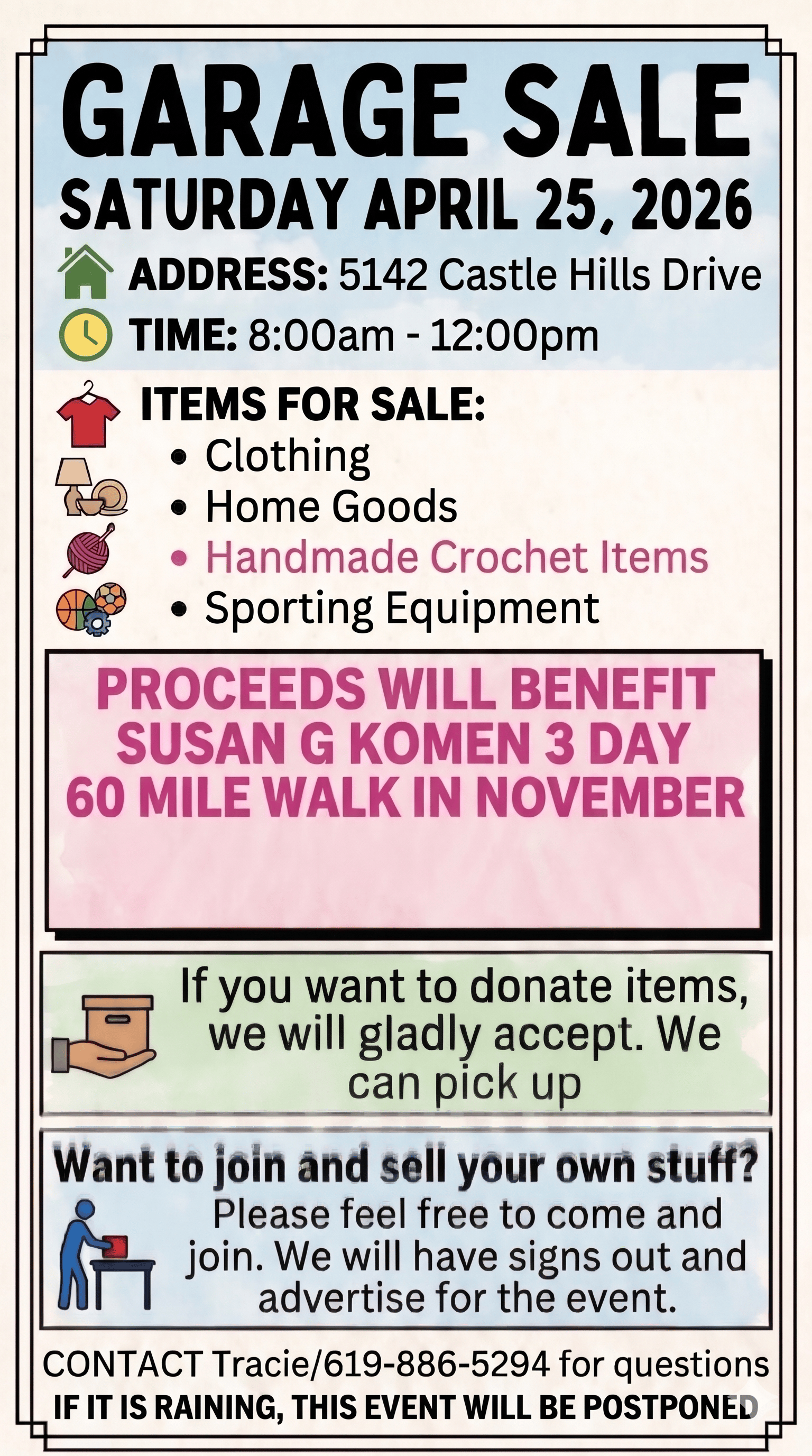 All the proceeds will go towards this year's Susan G Komen 3 Day Walk.