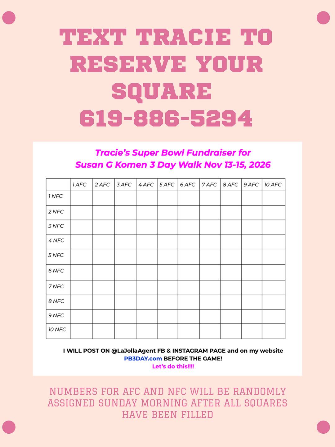 ONLY A COUPLE DAYS LEFT TO JOIN IN ON THE FUNDRAISER & A CHANCE TO WIN $$ DURING THE GAME!!! TEXT TRACIE IF YOU WANT TO PLAY 619.886.5294